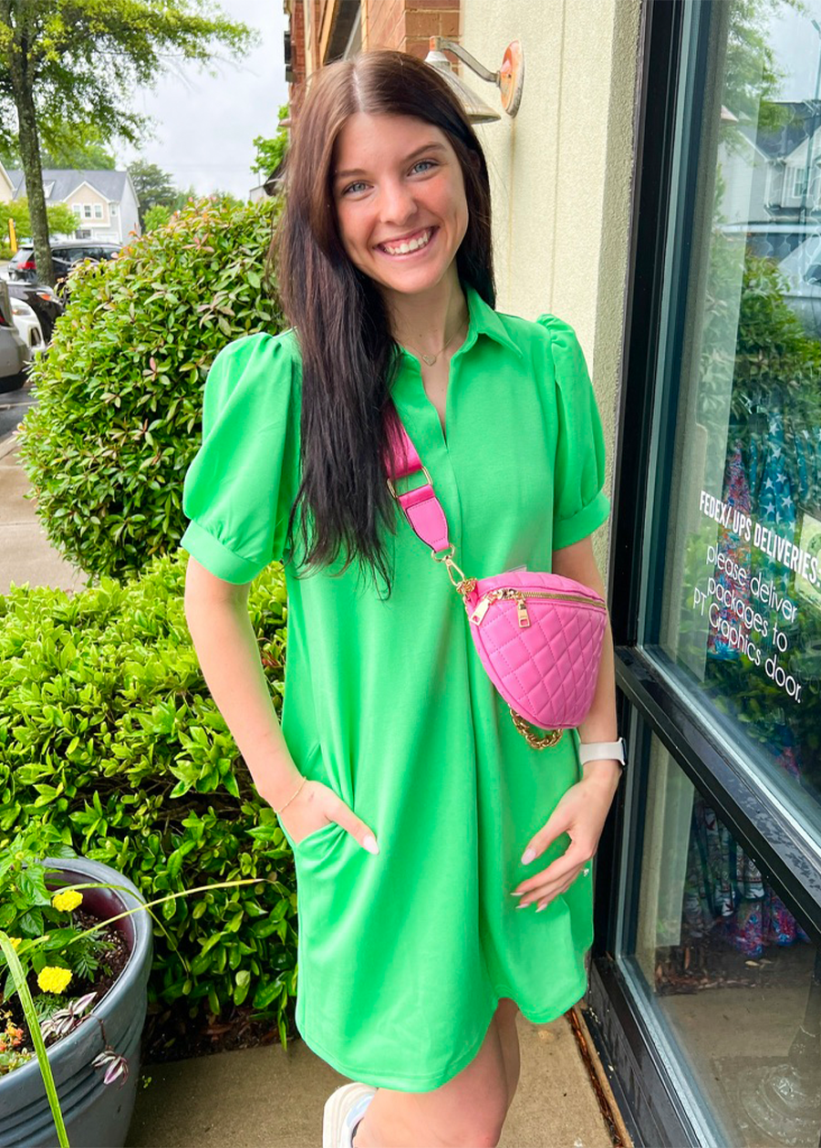 Introducing the Patsy Dress - your new go-to for everyday wear (with pockets!). Keep it simple and stylish in this basic green dress. Perfect for any occasion, you'll never want to leave home without it.