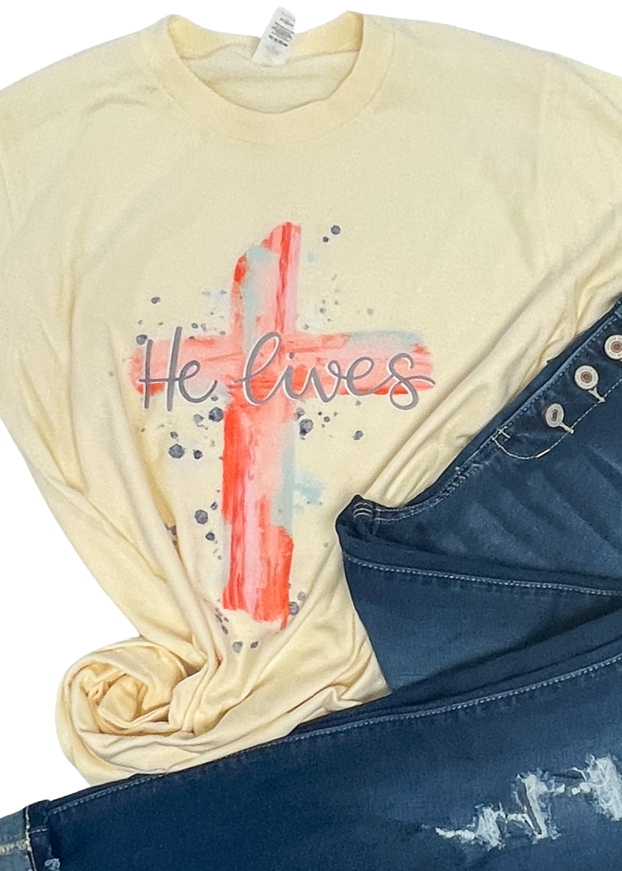 He Lives graphic design printed onto one of our soft style cotton blend unisex fit tees. Order your usual size.