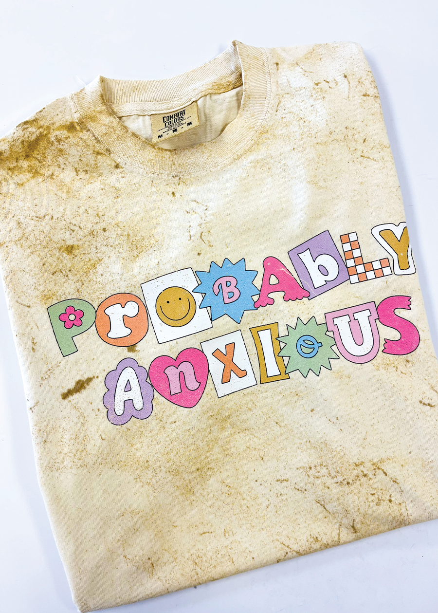 New Fan Favorite is our Probably Anxious graphic tee! Featuring Comfort Color's Color Blast, the t-shirt will be sure to make a statement with its cute and fun design. You don't have to feel anxious to wear it - it'll look great regardless!