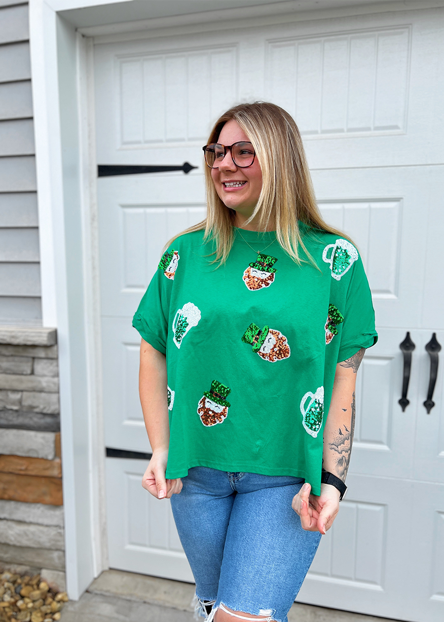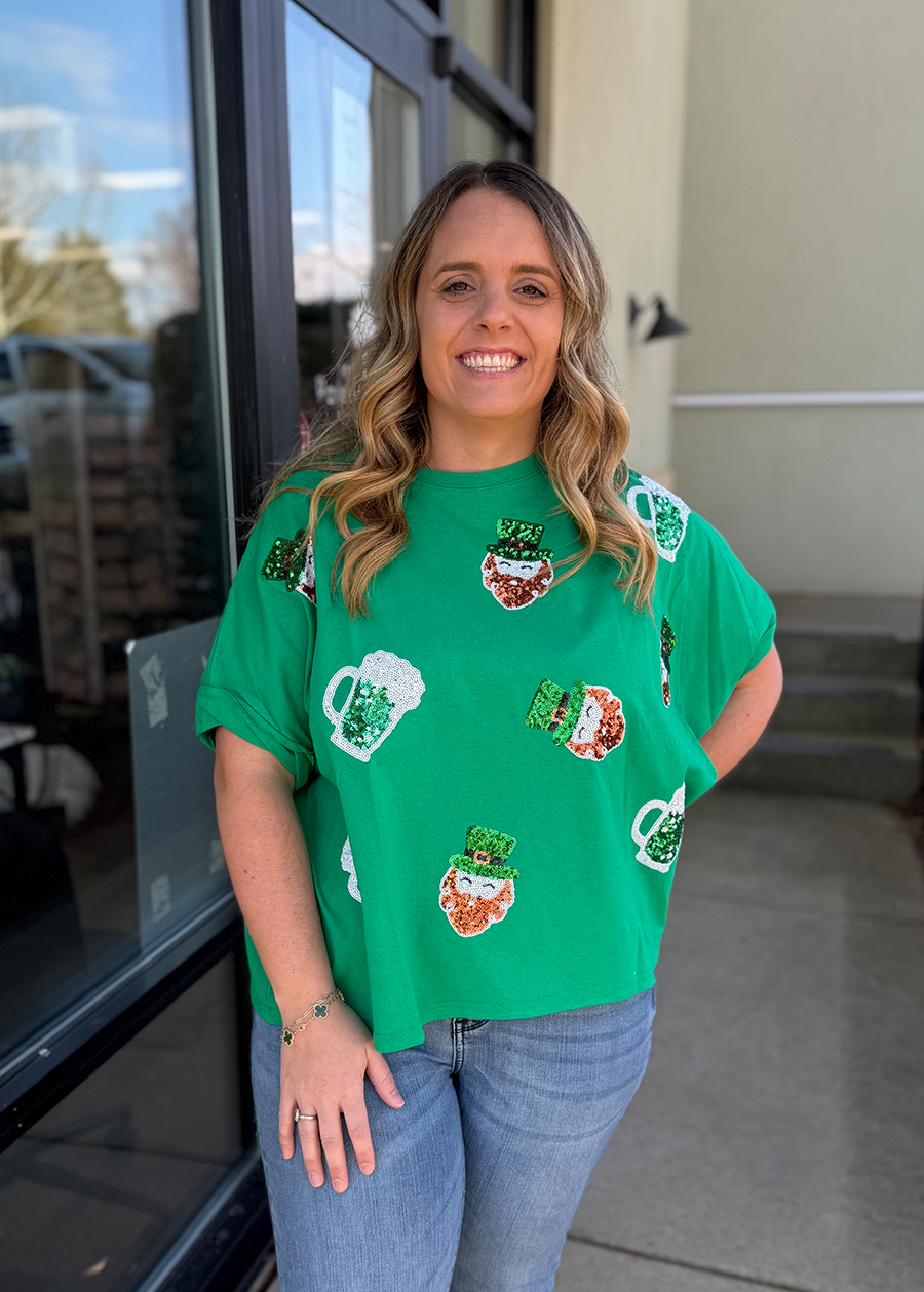 Get ready to shine this St. Patrick's Day with our Patty Top! Covered in vibrant sequins, this top will make you stand out in any crowd. Perfect for celebrating the holiday in style. Sláinte!