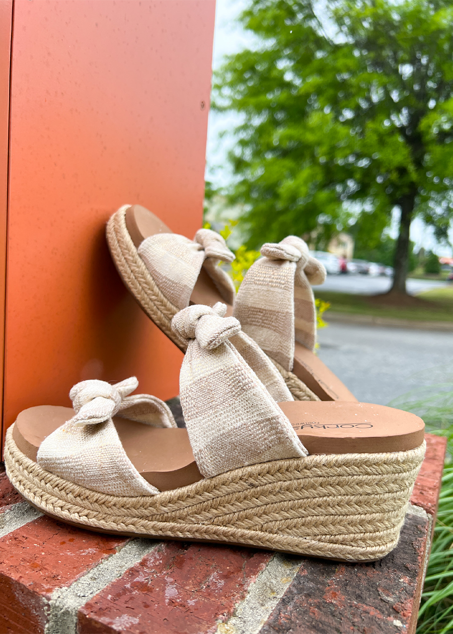 Tie up your style with our Corky Tie The Knot Wedge in a beautifully simple yet elegant design. Adorned with a charming bow detail and featuring a versatile neutral color, this wedge is sure to add a touch of sophistication to any outfit. Perfect for any occasion!