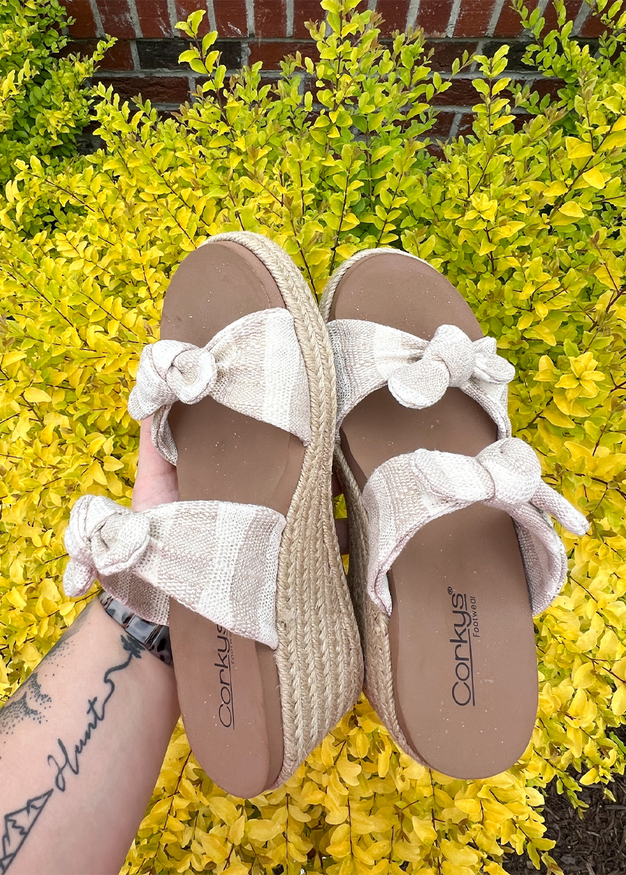 Regular price $35.00Tie up your style with our Corky Tie The Knot Wedge in a beautifully simple yet elegant design. Adorned with a charming bow detail and featuring a versatile neutral color, this wedge is sure to add a touch of sophistication to any outfit. Perfect for any occasion!